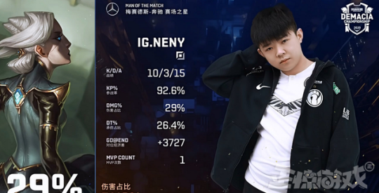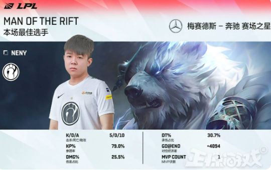 提到Neny这位新人上单选手,咱们就不得不说下,他在LPL夏季赛临时代替The Shy选手上场,在他职业生涯首战就用狗熊对抗LPL成名上单选手Bin,并拿下首战MVP的传奇故事。