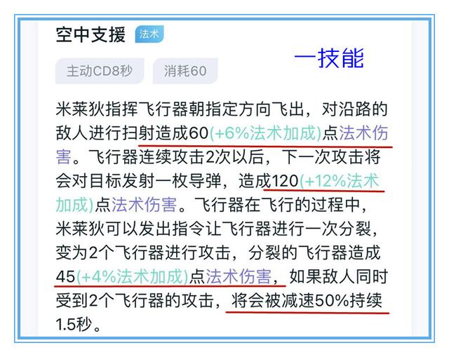 基础伤害是60+6%ap加成飞行器连续攻击两次后会发射一枚导弹,导弹可以造成120+12%ap加成的法术伤害米莱狄还可以手动让飞行器分裂,分裂的飞行器造成45+4%ap加成的法术伤害大家发现没有,即使米莱狄一技能的攻击距离、攻击半径再怎么增加,她原本的伤害就在这里,要想充分发挥她一技能的效果,我们就要为她搭配痛苦面具或者黄色打野刀这样的特殊功能装。