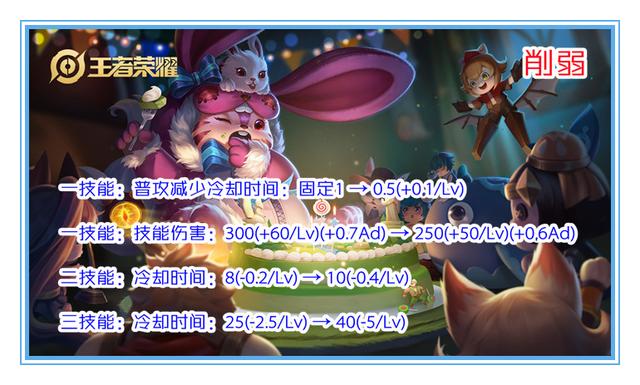 一技能:每次普攻降低的冷却时间从固定的1秒调整为0.5/0.6/0.7/0.8/0.9/1秒。并且技能伤害从300/360/420/480/540/600+70%ap加成调整为250/300/350/400/450/500+60%ap加成。二技能:冷却时间从原先的8/7.8/7.6/7.4/7.2/7秒调整为10/9.6/9.2/8.8/8.4/8秒。三技能:冷却时间从原先的25/22.5/20秒调整为40/35/30秒。简单地说就是一技能在降低伤害的同时,还对被动减cd做出了限制;二技能和三技能则主要 是对技能的cd时间做出调整。