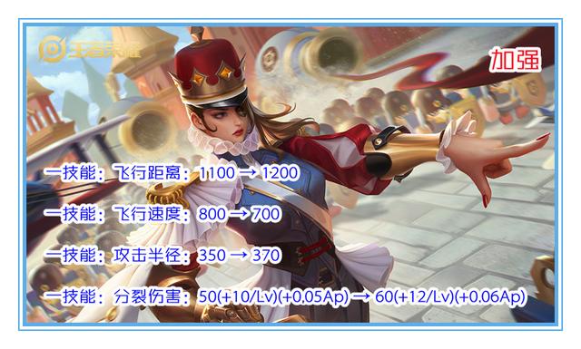 飞行距离从1100码增加到1200可以让她的一技能能打到更多的人一技能的飞行距离从800调整到700,这样有好有坏。好处是技能能够打的伤害更多了,坏处是比人更好躲了。一技能的攻击半径从350增加到了370,这个调整和飞行距离一样,也是让米莱狄的一技能可以打到更多的人。一技能的分裂伤害从原先的50/60/70/80/90/100+5%ap加成调整为60/72/84/96/108/120+6%ap加成,这个调整确实增加了米莱狄一技能的伤害。⑵我对米莱狄调整的看法