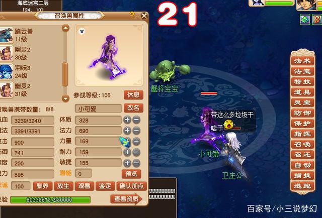 同样都是变异类型的召唤兽,参战等级低的变异召唤兽的价格反而要比参战等级高的变异召唤兽的价格贵,那是因为参战等级高的召唤兽只要技能和资质不好就没有用,而且飞升以上的召唤兽还不能通过顶书的方式将技能的数量顶到四个,低等级的变异召唤兽可以在宝宝环任务上交任务,从而获得150级制造指南书铁的奖励。这位玩家海底迷宫就碰到了一只变异的蟹将,结果因为自己身上带的召唤兽过多,而且没有解锁,所以只能等变异这样跑掉,这位玩家之所以不杀掉是因为他相信梦幻早期的一个迷信行为,那就是在战斗中击杀宝宝会降低自己在任务中的运气。