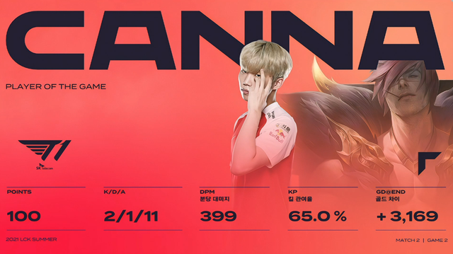 而在第二局中,拿出了梦魇上单的Morgan并没有很好地带起队伍的节奏,反倒又是Canna在第二局中凭借着腕豪成功在团战中限制了Deft的发挥。不难看出,经历了一个休赛期的调整之后,Canna似乎又恢复到了曾经被称之为“黎明上单”的状态与水准了。