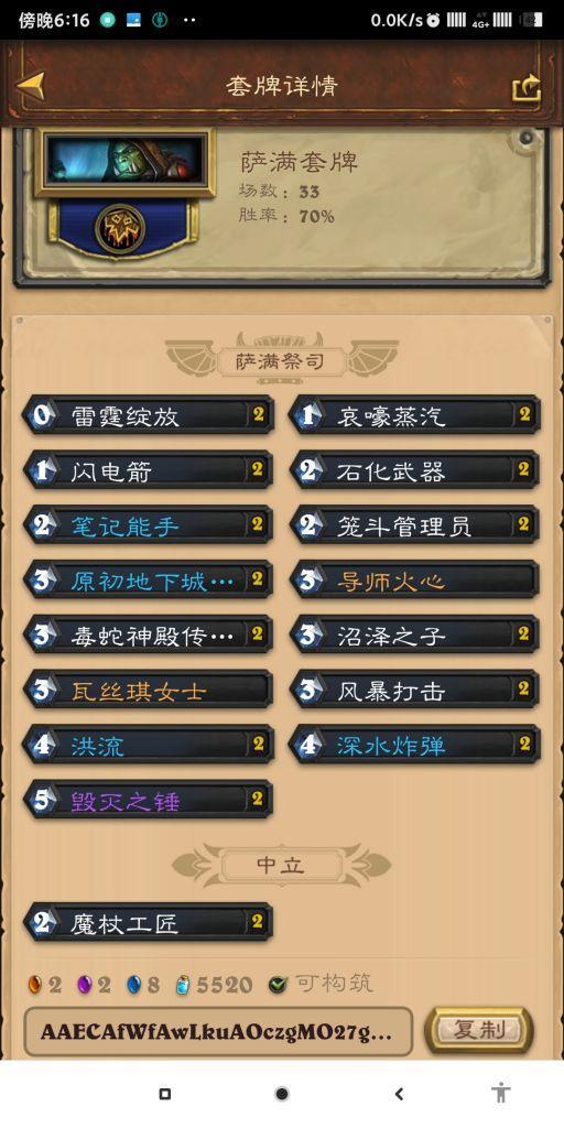 理论上,猎人的爆发比萨满慢一个轮次,我们有风暴打击/蛇门可以解场加输出/站场,有5费锤子之后深水炸弹的清场,有绝望时候的魔杖工匠找永恒之火,双方都天湖的情况下萨满上限更高,要有信心赢下这个对局。