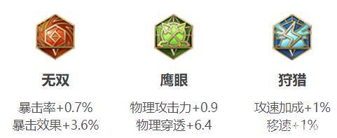 首先要讲的是铭文的搭配。搭配前我们可以知道阿轲这个英雄很大程度上需要靠背后偷刺来造成伤害,且暴击伤害尤为突出,所以根据其被动的特性,我们需要佩戴带有暴击率、暴击效果、攻击力的铭文,其次就是要带上有移速及攻速的铭文,因为阿轲的普通攻击也可以造成不少伤害,所以最终推荐搭配的铭文如下:红色铭文佩戴无双,增加一定的暴击率和暴击效果,配合上被动可以打出更高的伤害,绿色铭文佩戴鹰眼,增加基础攻击力和物理穿透,蓝色铭文佩戴狩猎,增加攻速和移速。此套铭文较适合打野节奏快的英雄。