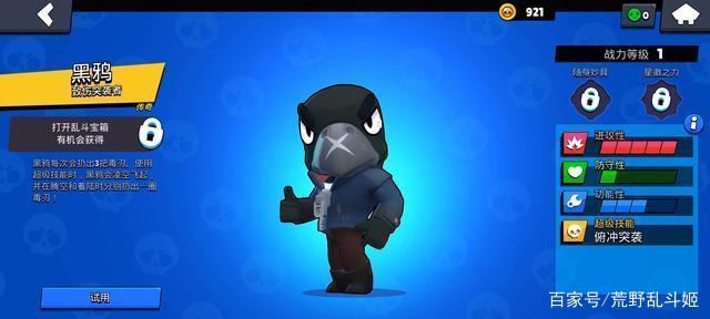 黑鸦在《荒野乱斗》中,是一个全攻击性的英雄,基本没什么防御力,等于那种一碰就死的英雄,而且,血量也特别薄,这是黑鸦致命的缺陷,所以他的妙具和星耀都是为了提升他的防御能力而服务的。