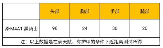 源·M4A1-黑骑士和绝大多数M4A1系列的武器一致,我们在满天赋且有AC的条件下简单测试了一番,得到了下图中的伤害数据。不出意外的话,这份伤害应该不会被调整,因为除了雷神、星象等少数伤害+1的M4A1之外,所有M4A1的伤害都是一样的。