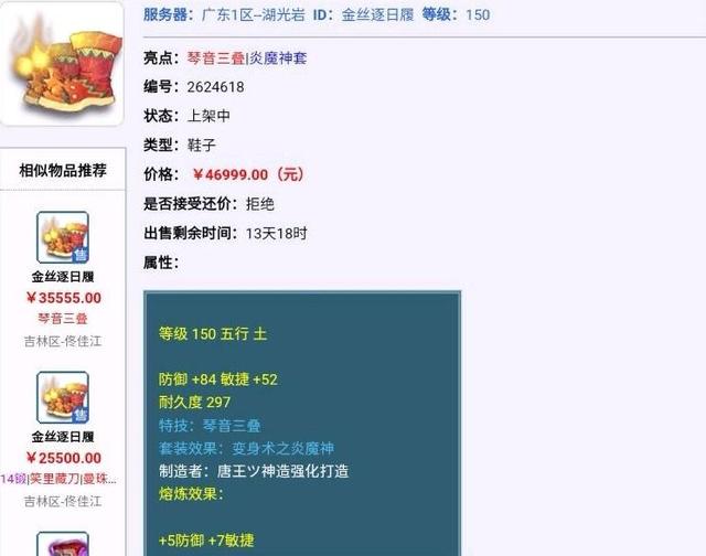 上面是一双150级拥有着琴音三叠的鞋子,点化出来的是炎魔神的变身套装,也就是上面的这双鞋子是可以给法系门派的玩家使用,只是大家有没有发现一件事情?现在拥有琴音三叠特技的装备变得越来越贵了,除了链子位置的装备之外价格都在提升,哪怕是腰带,那种只有着琴三叠的高等级腰带现在也很值钱,小编感觉这就跟当年的破血一样,当所有法系的玩家都普及了琴音三叠之后,琴音三叠可能也会变成现在的破血狂攻。
