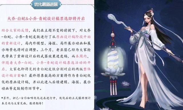大乔和小乔的姐妹皮肤——白蛇和青蛇皮肤即将开启重做票选活动,每款皮肤方案二选一,由玩家来决定。
