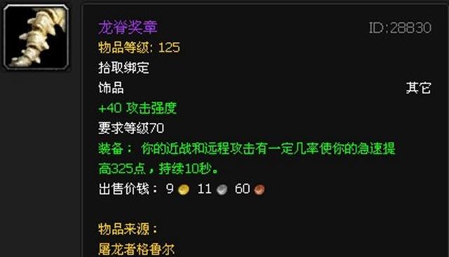 客观来说,龙脊奖章的确是一件不错的装备,这件装备是格鲁尔的巢穴最终boss格鲁尔掉落的,物品等级是125,长驻属性是40点攻强以及近战和远程有一定几率使你的急速提高325点,持续十秒。