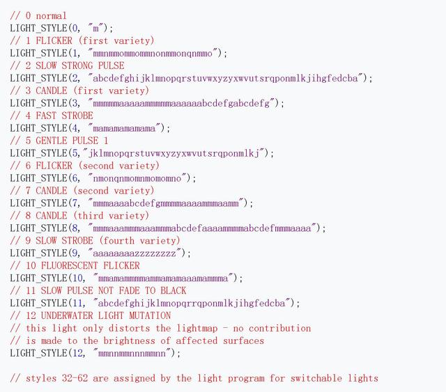 下图是《半条命》的源代码,可以发现大量的字母组合实现了不同的灯光效果。在那个年代绝对是非常震撼的。