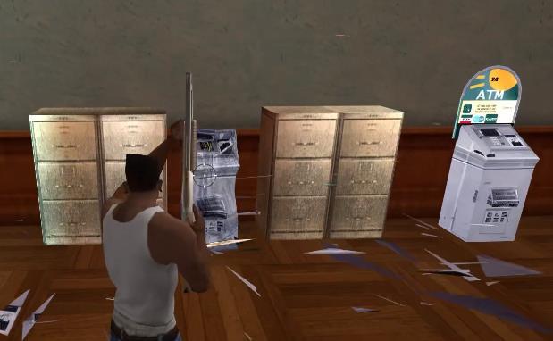 相比较罪恶都市专业的抢劫,到了GTASA中抢劫就好像儿戏一般,我们需要打破这些ATM机,然后拾取纸币,最后逃脱,没有专业的动作,也没有精美的CG动画,一切总是那么随然,谁让GTASA都做了地图了,所以在剧情方面的建设要精简一些!