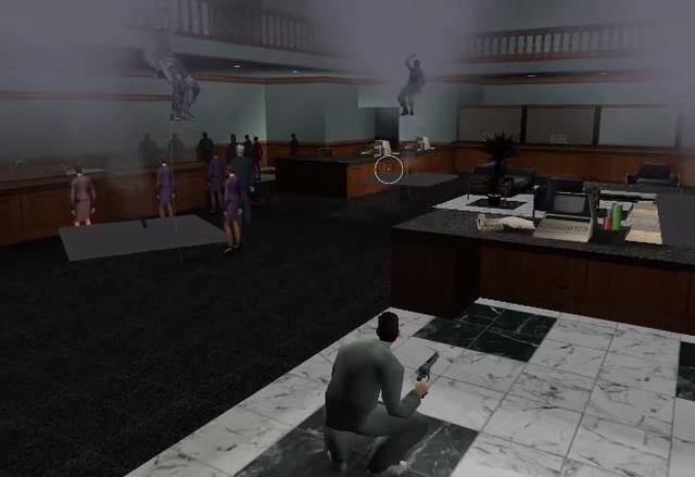 首先就是罪恶都市时期的抢银行,此时的汤米依旧是一个不会游泳的主角,你别看这款游戏的画质不好,在当时绝对是一顶一的存在,而且R星对场景的部署也非常用心,你看此时FIB直接索降到银行内部,而且四处都是烟幕弹,这样战术性的场景设定似乎非常专业,可见R星的用心程度有多高,现在体验也感觉效果贼好!