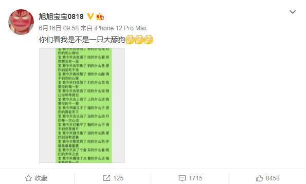 旭旭宝宝和老婆韩茜茜的感情大家也都清楚非常好,两人时不时就在直播间秀恩爱撒狗粮,让很多单身粉丝羡慕。而就在近日,旭旭宝宝晒出了一组同老婆韩茜茜的聊天记录。搞笑的是里面的内容和王校长的经典语录有着异曲同工之妙,而且旭旭宝宝还在文案备注说:“看我是不是一只大舔狗”,一时间粉丝竟觉得他在内涵王思聪。