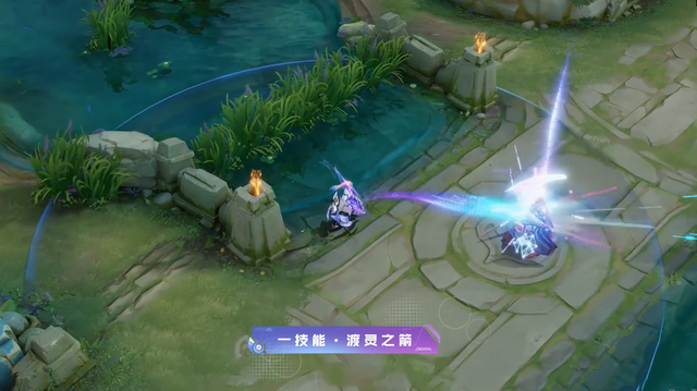 天狼溯光者最大的亮点还是她的二技能特效,伽罗在蓄力的时候整个武器会直接变形,就像一张巨大的蜘蛛网一样,随后武器前面还会出现一个七彩漩涡,发射出去的依然是一只水晶巨箭,地面上则会出现一个巨大的KPL标记。