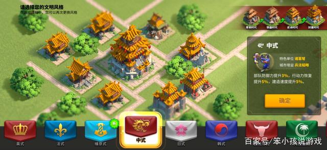 当然其他文明也有对应的属性加成,中期可以转换成韩式风格,因为需要提升研究的速度,韩式风格可以附带3%研究速度加成,后期储备兵力的时候,再次转换成德式风格,因为德式建筑风格的5%训练加速,能迅速让我们拥有一只满编的部队。如果是骑兵玩家,还能享受骑兵属性5%的攻击加成。