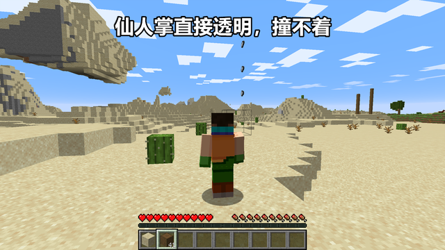 从小河中爬上来,刚好看到了沙漠中仙人掌,众所周知,玩家直接撞上仙人掌是会受到伤害的,于是乎我朝着一株三格高的仙人掌冲了过去,然后自己就傻眼了,仙人掌直接原地消失,取而代之的是上方三个小铁粒。不过仙人掌也并非消失了,而是化身成了透明方块一般,还在原来的位置,但是不会对玩家造成伤害。