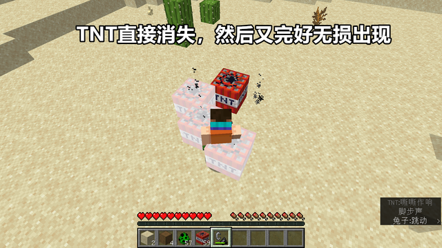 苦力怕不炸我,那我就自己炸,于是乎收集了一波合成TNT的材料以及打火石的材料,我开始准备自己炸自己了。将TNT摆在地上,然后站在TNT中间,用打火石点燃TNT,TNT闪着白色亮光,就当我准备结束这个挑战的时候,TNT离奇消失了。傻眼的我呆愣在原地,几秒后TNT又再次出现在原来的位置,完好无损。