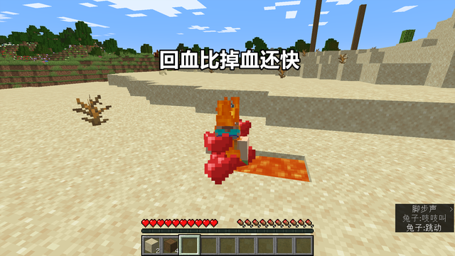 思考着该如何作死的我碰到了一小片熔岩,于是乎尝试在熔岩中游泳就成了我作死的方法,但跳进熔岩中才发现,还是太年轻了。跳进熔岩的我确实浑身着火并受到了伤害,但是跳进去的瞬间玩家就得了一个治疗效果,回血的速度远远超过掉血的速度,所以无论你在熔岩中游多久,你都死不掉,而且不会掉一点血。