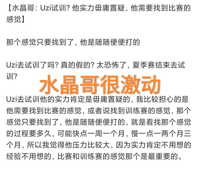 春季赛的时候和rng战队合同的问题引来了大量网友的热议,因为那段时间都在传uzi夏季赛复出的消息,但是商业合同被售卖之后复出的消息也被搁置了,甚至uzi都表示今年没有了打比赛的想法,那段时间里大家都觉得uzi已经彻底离开了比赛的舞台,就连官方解说比赛他都不参与了。很多的粉丝纷纷为小狗感到惋惜,作为一名顶尖的职业选手,在状态还不错的时候,如果不能继续打比赛的话,肯定会留下一生的遗憾的,毕竟那个梦寐以求的世界赛冠军奖杯还没有捧起过。