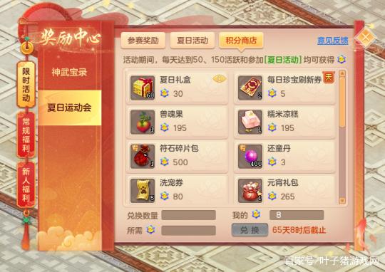 除了以上夏日运动会的六大活动,如果顺利攻略任务,就能累计获得一定的夏日积分,积分商店兑换领取包括夏日礼盒、还童丹、洗宠券、珍宝刷新券等奖励。当然啦,参赛选择不同阵营,也会获得对应阵营的称谓,最强的是“王牌选手”,奖励有高级宝图等。