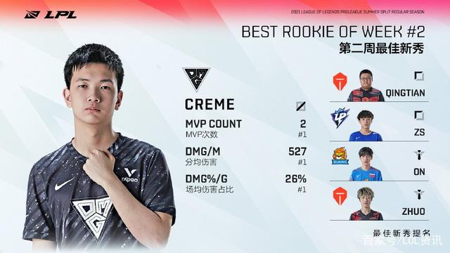 最后还有最佳新秀榜,最佳新秀由OMG的Creme斩下!小编认为,Creme上榜有RNG的一份功劳,因为RNG对阵OMG时选出了四保一阵容,核心是Gala,而Creme的奇亚娜和阿卡丽都是对ADC能够造成极大威胁的英雄,特别适合打RNG!