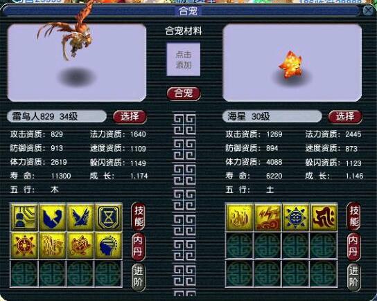上面这组是合成个性宠的,因为上面的这位玩家用的这两只召唤兽,其中的一只是四技能的海星,而且这只四技能的海星还拥有的出其不意和须弥真言双特殊技能,另外是一只八技能的雷鸟人,海星有着两个必带的召唤兽技能,但是海星也因为着两个特殊技能,所以海星没有打掉必带的召唤兽技能,雷鸟人因为不是主宠的原因,也没有打掉太多的技能,仅仅只打掉了一个雷击,所以上面的这组炼妖能够合出来的召唤兽技能数量上限能够达到13个,也就是13技能的出其不意的须弥雷鸟人。