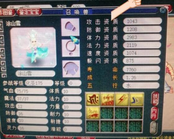 看到上面这只拥有着五个技能的涂山雪了吗?这只涂山雪虽然只有五个技能,但是她的这五个技能就包含着出其不意和须弥真言双特殊技能,而且还有的用于输出的大法和高级神佑复生,最关键的是这是一只零级的野生召唤兽,这样的召唤兽有可能是某位低等级的玩家炼妖石的时候合出来的副宠,他们没办法使用,而且因为零级野生的原因,卖的还比较便宜,这样就便宜了175级的平民玩家,他们可以以比较低的价格入手这样的召唤兽。