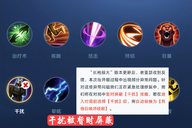 而这一次新版本更新后,玩家不能够进入到游戏中的原因也已经找到了,主要原因就是召唤师技能干扰,官方决定在对局中暂时屏蔽干扰技能,如果大家进入游戏的时候选择干扰,将会自动替换为其他的召唤师技能,所以大家一定要注意,现在新版本更新之后,这个问题肯定将会紧急修复,但是官方决定先保证新版本正常开启,所以才会暂时屏蔽召唤师技能干扰。