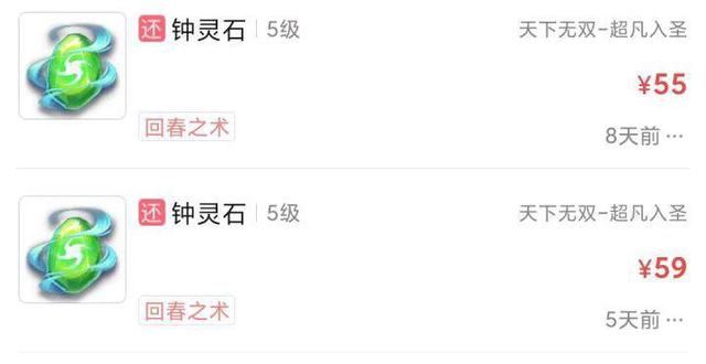 或许买家真的不了解钟灵石的行情,所以不知道5级回春之术值多少钱,所以没有当场回复卖家的价格。通过查看藏宝阁发现,5级钟灵石的出售价格为55元左右,那么两个就是110元,相当于1300万的游戏币。