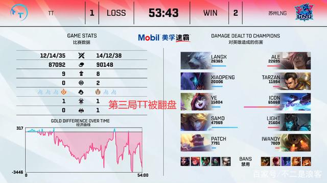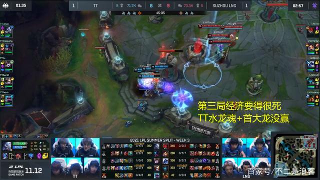 不过在LNG和TT的第二局比赛里,节奏迎来了一波反转,TT的打野Xiaopeng和中单Ye在比赛前期节奏爆棚,盲僧几波天秀基本上奠定了上半野区的优势,缓解了上单Langx纳尔对阵卢锡安的压力,最后中路Ye的妖姬虽然前期的发育不好,但是其刺客性质也是让LNG众人在团战中疲于应对,在第三把中两边都打得很谨慎,到四十分钟两边经济都咬的很死,可以说是拖到大后期了,结果因为TT几波优势团的犯病,拿到了风龙魂和大龙的TT被LNG翻盘,终结LNG连胜失败。
