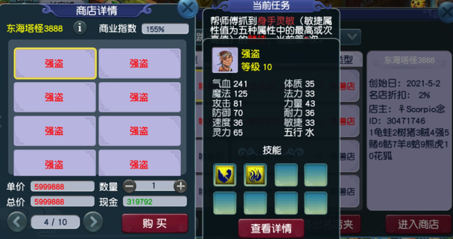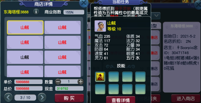 像是这种将近600W的强盗、山贼并不会大批量出现,而是在正常价格中“稍微”掺杂几只,从而实现以假乱真的效果。我们可以想象一个场景,比如说师傅要一只“身强力壮”的强盗,此时玩家就会带着目的来到商会寻找,打开一个店铺后,发现价格是X999,如果感觉不贵,那么就会继续找身强力壮的那一只。