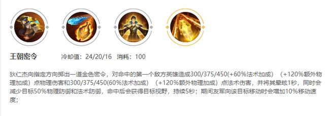 大招:六令追凶:狄仁杰丢出一张黄牌,命中敌方英雄,会造成物理和法术双重伤害,该敌方英雄会进入一秒的眩晕状态,和降低50%的物理防御和法术防御。命中期间队友攻击该敌方英雄会获得10%的移速加成。