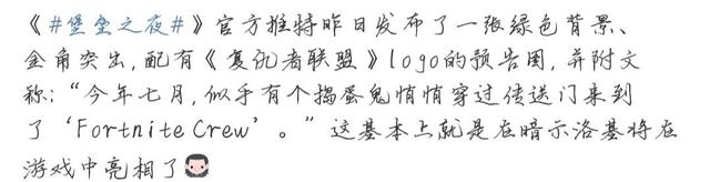 堡垒之夜的官方在推特上发布了一则消息,官方在推特发布了一张绿色背景、金角突出的预告图片并且还附上了复联的logo。