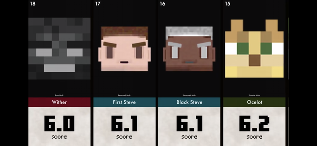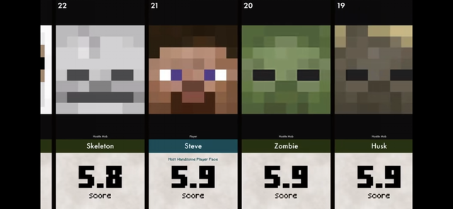 作为《我的世界》男主角的史蒂夫,和一众黑暗生物排在一起,也太没面子了吧?虽然史蒂夫原皮确实普普通通,就是一个留着平头的皮肤黝黑的青年,但是,这AI系统把他加塞在小白(骷髅)和僵尸的中间,真的让人有些哭笑不得了,综合评分5.9,位列排行榜第21。
