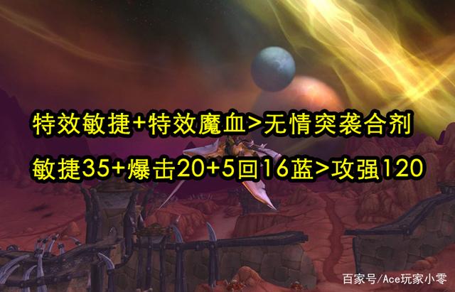 小零不是很建议猎人使用“无情突袭合剂”。因为战斗药剂+守护药剂提供的属性,对猎人而言,更加优于单一的120点攻强。当然,如果是开荒团队,总是团灭的话,也可以为了省钱吃一瓶合剂。