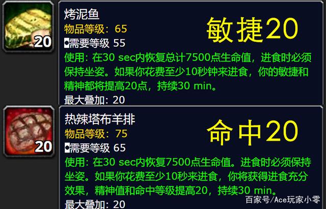 除了宝宝之外,猎人本身也要吃一个敏捷烹饪。之前推荐的烤泥鱼和迁跃兽汉堡都是一样的效果,根据各自服务器的价格,选择一个即可。但如果猎人的命中等级没有达标,那就不能吃这俩了,应该吃“热辣塔布羊排”,可以增加20点的命中等级。这边多嘴说一句,猎人的命中达标线是142哦。