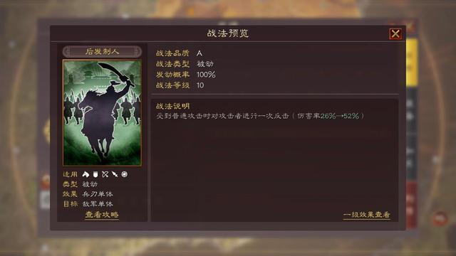 因为嘲讽吸引敌军2人的普通攻击2回合,所以带反击类战法为最佳。其中B级战法还击拆自何进,A级战法后发制人拆自皇甫嵩。