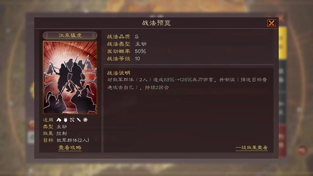 孙坚自带江东猛虎,是一个群体兵刃输出兼嘲讽战法,输出能力因为50%的概率很靠谱。