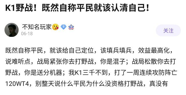 在打联盟战的时候,大部分玩家都喜欢更加自由地“打野”,而对于较为机械的填兵可以说玩家们确实都不太乐意。毕竟“打野”的收获和损失相比于填兵真的要好很多,损失小还收益大,并且乐趣也要来得更加直接。而最近,枝桠发现有一位氪金玩家直言平民玩家没资格“打野”。