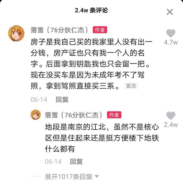 不少的网友认为人生不只是200万,还有诗和远方。落雪在评论中有这样一句话:后面拿到钥匙我也会只留一把。这句话和前面“房子是自己买的我家里人没有出一分钱,房产证也只有我一个人的名字”呼应,有网友推测落雪与家人关系并不和谐,落雪存在一个性格上的问题也是很明显的,比如自私、狭隘、自大等比较突出。