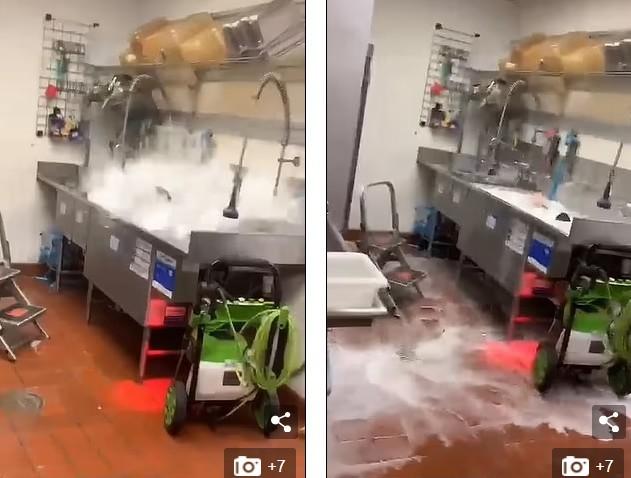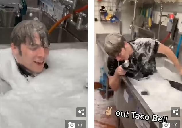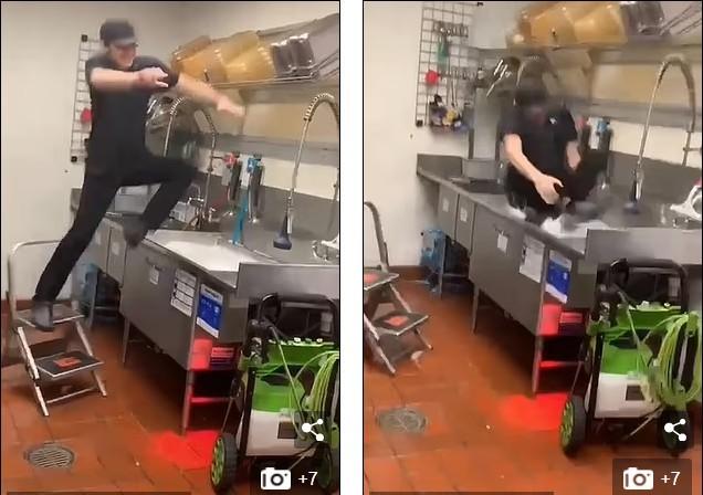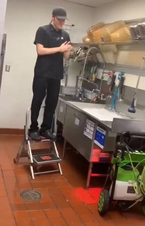 这个自动洗碗槽是用来清洗店里的餐具,水温通常非常热,Pauley跟同事还特别丢一些冰块进去,接着扶住帽子、爬上矮梯,就往里面跳了进去,泡了好一下才顶着浑身泡沫,拎着帽子和餐具爬出来。
