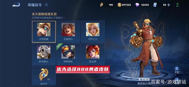 而在尝到了免费获取的皮肤升级为史诗的甜头后,大家对于每个赛季战令皮肤宝箱的更新愈加期待,也知道该如何选择,不管皮肤品质高低,直接选择888勇者皮肤就对了!例如本赛季加入宝箱的皮肤虽然有花木兰兔女郎和大乔守护之力两款变色特效皮肤,但优先选择的肯定是达摩大发明家,该皮肤也将会在未来的某个时间点获得品质升级。