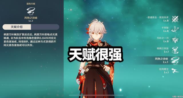 第二,零命万叶虽然没有获得200点的元素精通加成,但是只要玩家的圣遗物够好,利用万叶升到70级之后的天赋【风物之诗咏】万叶打出元素反应后,可以给队伍中其他角色提供相对应的元素伤害加成,100点元素精通可以提供4%的元素伤害加成,而毕业的万叶基本上都有800+的元素精通,这样一算,有了万叶就相当于多了一个小的元素伤害圣遗物,对于需要靠元素反应的主C,万叶成为了他辅助的不二人选。