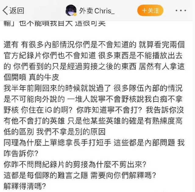 Chris的这条微博,大致内容都是在帮宁王洗白。Rookie在最近的直播中,明确表示宁王不会回到IG战队了。之前宁王在转会期的时候,去LGD战队试训遭到了否决。现在的宁王没有一个战队愿意购入,处境尤为尴尬。不过Chris却在微博中表示宁王在野核版本中,能够拿出野核英雄,只不过熟练度有高低。这句话不就是再说他能拿出来但玩的不行吗?