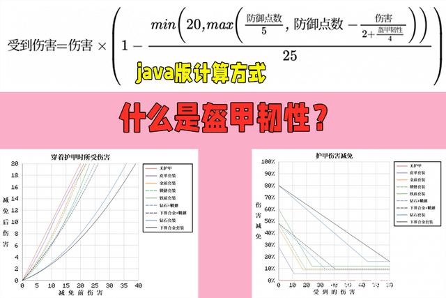其实,《我的世界》java版本的护甲值系统更为复杂,它并不能笼统地用“1点护甲吸收4%的伤害”来计算,因为它涉及到盔甲韧性这一因素,具体计算公式上见图,在所有的品级分类中,只有钻石套装和下界合金套装具有盔甲韧性,其中下界合金套装最高,这也是它胜于钻石套装的优势之一。