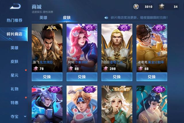 而这一次在体验服中,王者荣耀把碎片商店中的皮肤进行了一个大轮换,很多的热门史诗皮肤全部可以免费兑换,比如说公孙离的无限星赏官,还有百里守约的特工魅影以及韩信的街头霸王,甚至是还有好几款传说皮肤也加入到了碎片商店中,比如说孙尚香的末日机甲以及干将莫邪的久胜战神,这样的话只需要我们到达王者段位,就可以使用皮肤碎片来兑换永久的传说皮肤了。