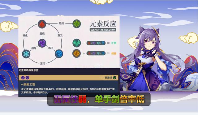 雷元素不管是从共鸣,还是反应,其实都是偏向于辅助功能。首先咱们看双雷共鸣,能够为队友提供雷元素“微粒”,等同于给队友当个充能“工具人”罢了。再者咱们看元素反应方面的作用。