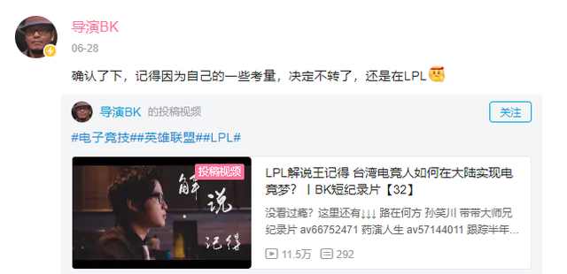 如图所示,这是曾经为记得制作过纪录片的导演,拍摄过他生活和工作上的内容,两人算是认识,他爆料记得不准备转型LOL手游解说了,还是留在LPL!