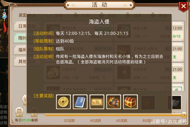 就是要知道海盗入侵活动的时间,他分为两个时间段中午的12:00~12:15(东海渔村)及晚上的21:00~21:15(无名小镇)两个时间段共用活动的次数5次。