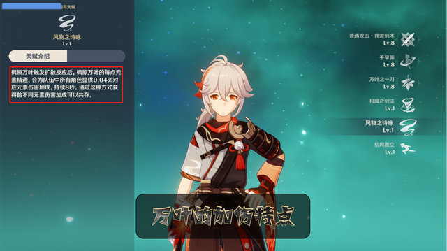 万叶的E技能和大招在释放之后,风元素伤害在触碰到风、水、雷、火四种元素之后,都可以获得额外的元素加伤。同时万叶的元素精通加元素伤害的机制。与温迪相比,特色就是能够增加阵容的整体伤害。能够让永冻流的伤害直接最大化。尤其是1层命之座以上的万叶。